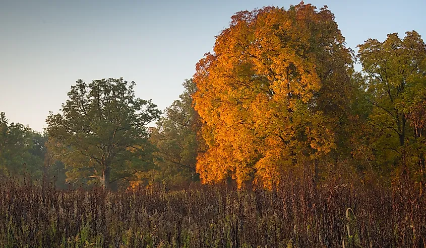Surrounded by open farmland and rolling hills near the Gallatin River, Manhattan offers wide, peaceful views as the landscape shifts into soft oranges and deep rust tones. The clear autumn air and quiet backroads make this part of Montana feel calm and open, with big skies stretching in every direction.