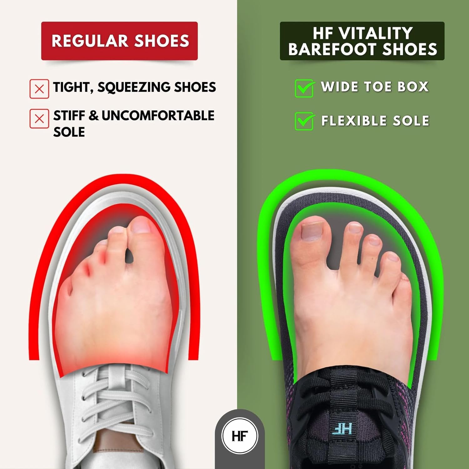 Step Into a World of Comfort, Pain-Relief, and Freedom! Traditional shoes have been lying to your feet for years. Cramped toe boxes, rigid soles, and unnatural shapes have left our feet weak, misaligned, and often in pain. It’s time to break free from the shackles of conventional footwear and embrace the revolution. Imagine slipping on a pair of shoes that feels like you’re wearing nothing at all. Discover Your Natural Vitality These revolutionary shoes provide the authentic sensation of natural movement while offering essential protection for your journey. Engineered to let your feet breathe and move as nature intended, HF Vitality shoes strengthen your foundation with every step. They guide your body toward optimal alignment, fostering natural stability and balance. The thoughtfully designed support system provides the perfect blend of freedom and protection, helping you stay energized during your all-day adventures.